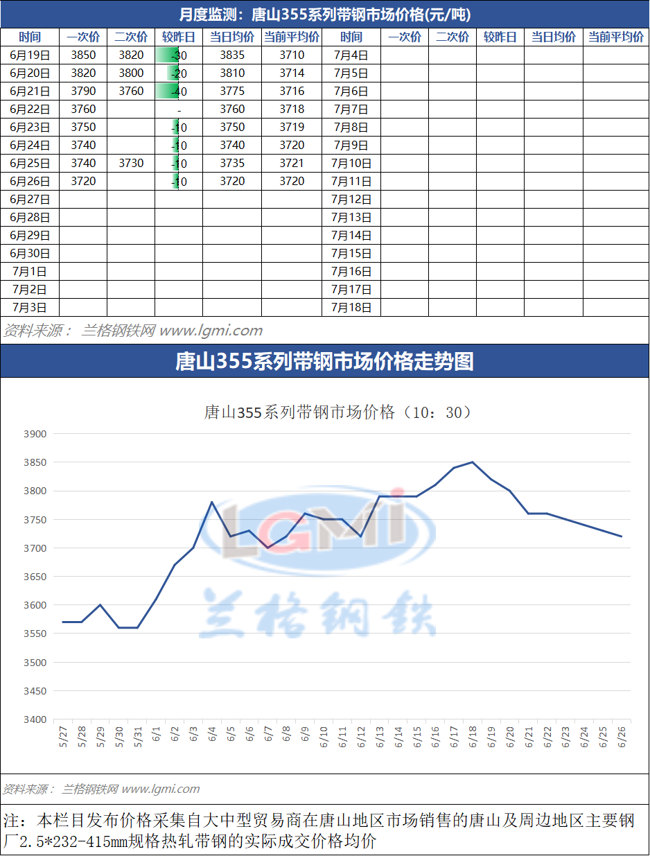 据兰格云商平台监测数据显示,截至6月26日(10:30),唐山地区355系列带钢市场价格为3720元,较昨日市场收盘价格降10元。
