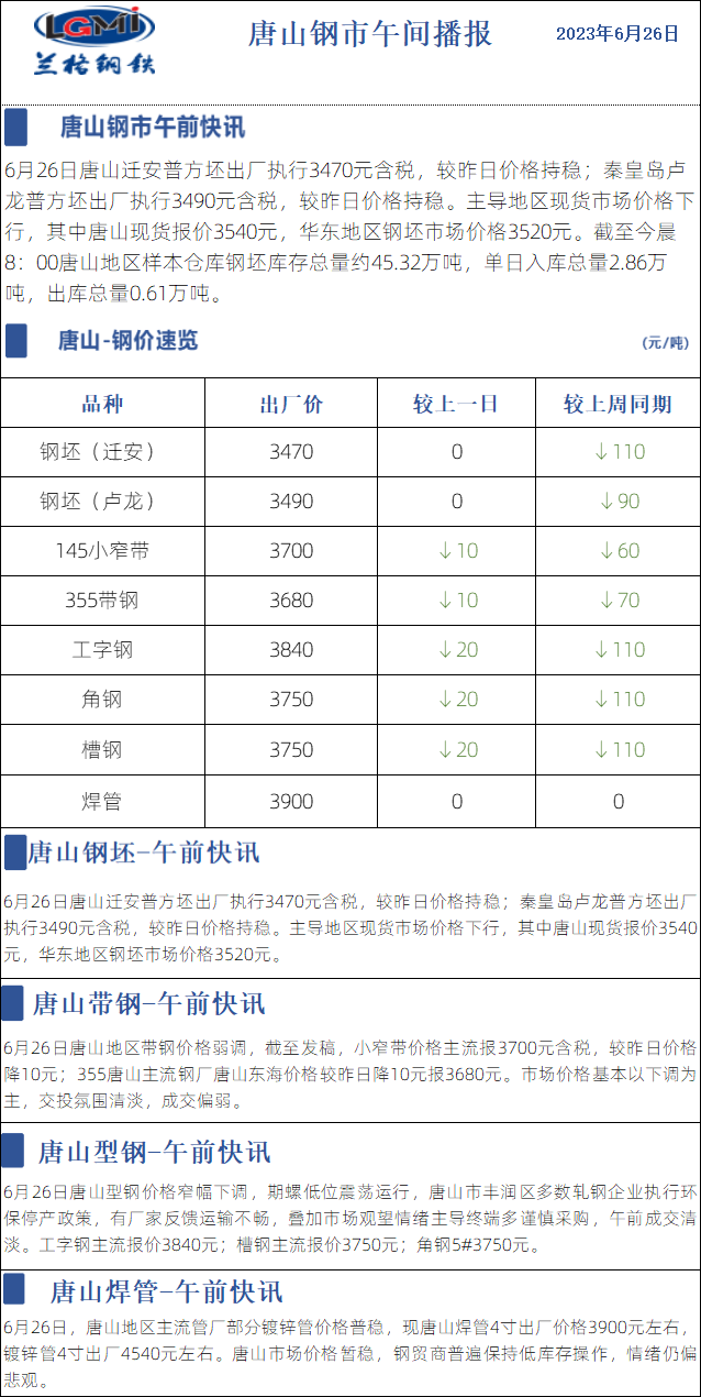 6月26日兰格唐山钢市午间播报