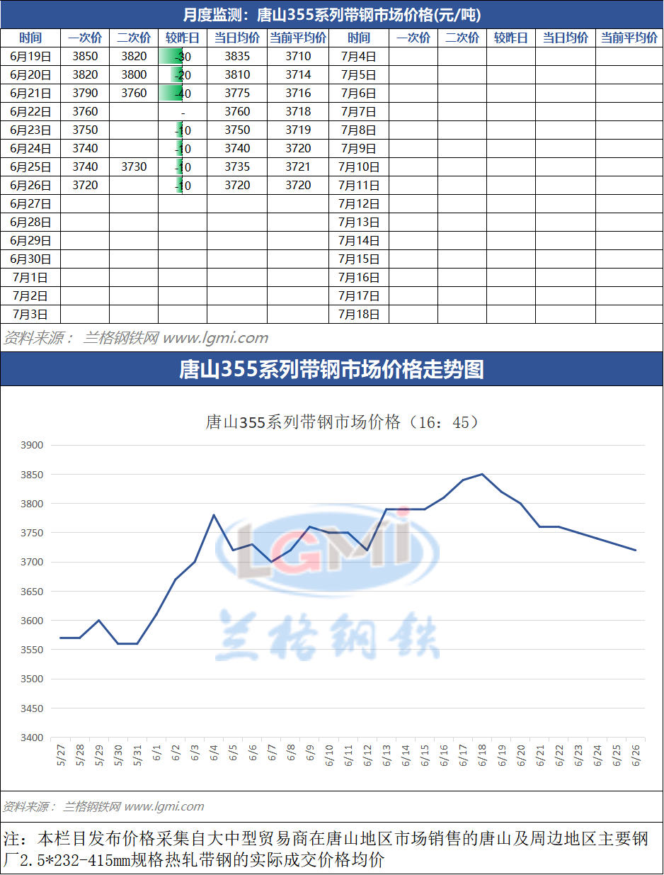 据兰格云商平台监测数据显示,截至6月26日(16:45),唐山地区355系列带钢市场价格为3720元,较今日市场价格持稳,较昨日市场收盘价格降10元。