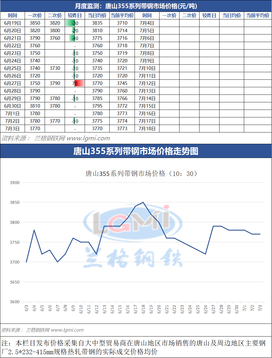 据兰格云商平台监测数据显示,截至7月3日(10:30),唐山地区355系列带钢市场价格为3770元,较昨日市场收盘价格持稳。