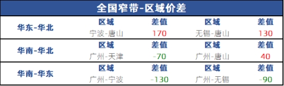 从区域价差来看,华东与华北价差130-170元;华南与华北价差40-70元;华南与华东价差90-130元。