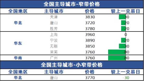 ●市场概览:据兰格钢铁网监测数据显示:今日国内带钢市场价格主流下调,截至发稿:唐山145小窄带首唐宝生报3770元,较上一交易日价格降30元;355系主流唐山东海报3720元,较上一交易日价格降20元;华东地区,无锡热轧带钢(2.5*355mm)中天报价3850元,较上一交易日价格降30元;华南地区,乐从热轧带钢2.5*(232-355mm)唐山瑞丰报价3760元,较上一交易日价格降80元。