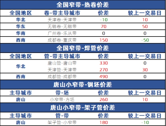 从品种价差来看,天津卷带价差10元,无锡卷带价差70元,广州-乐从卷带价差0元,成都-重庆卷带价差150元;唐山管带价差330元,天津管带价差270元,成都管带价差490元;唐山坯带价差260元,唐山架子管带价差180元。