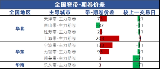 全国窄带期卷价差部分较上一交易日缩小,具体如下: