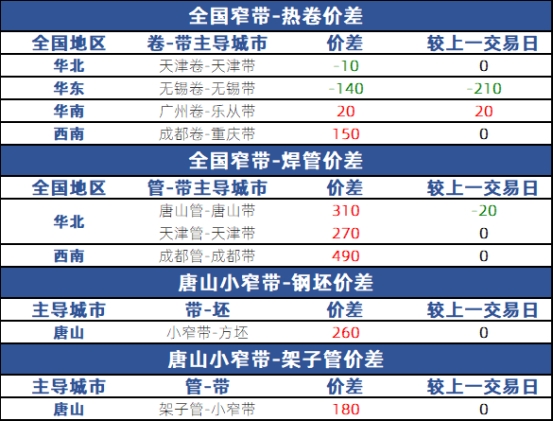从品种价差来看,天津卷带价差10元,无锡卷带价差140元,广州-乐从卷带价差20元,成都-重庆卷带价差150元;唐山管带价差310元,天津管带价差270元,成都管带价差490元;唐山坯带价差260元,唐山架子管带价差180元。