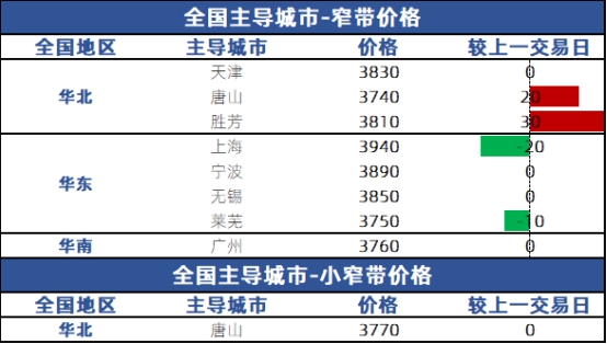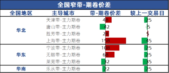 全国窄带期卷价差部分较上一交易日缩小,具体如下: