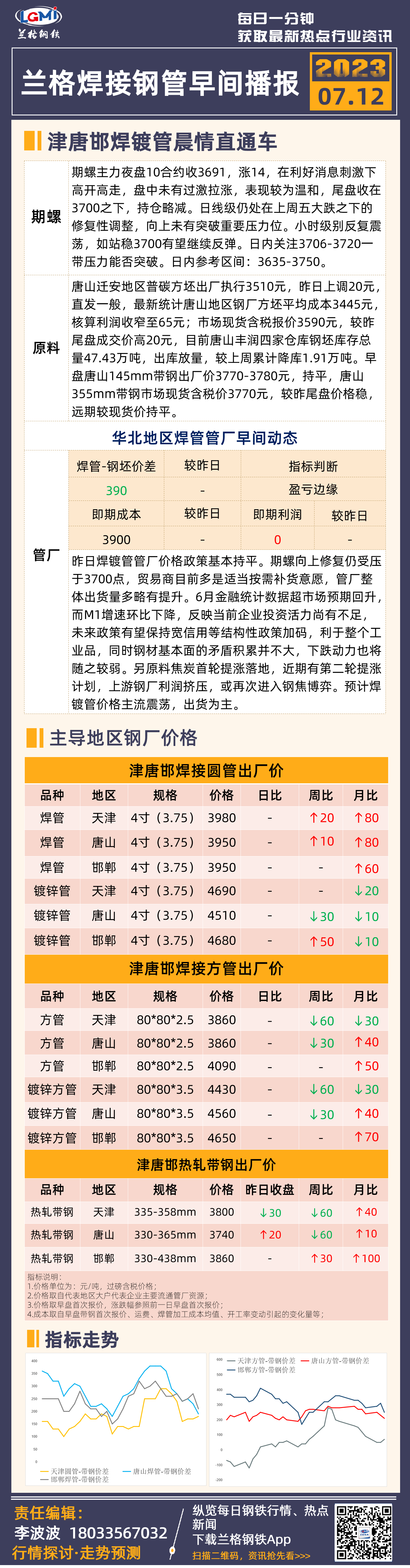 7月12日(9:20)兰格津唐邯焊管、镀锌管早间速递