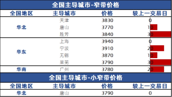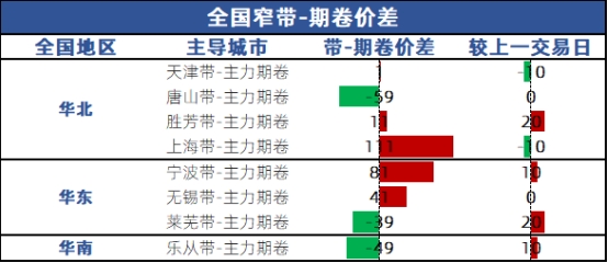 全国窄带期卷价差较上一交易日窄幅波动,具体如下: