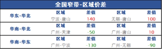从区域价差来看,华东与华北价差100-140元;华南与华北价差10-50元;华南与华东价差90-130元。
