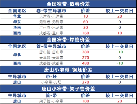 从品种价差来看,天津卷带价差10元,无锡卷带价差60元,广州-乐从卷带价差30元,成都-重庆卷带价差160元;唐山管带价差280元,天津管带价差270元,成都管带价差480元;唐山坯带价差270元,唐山架子管带价差180元。