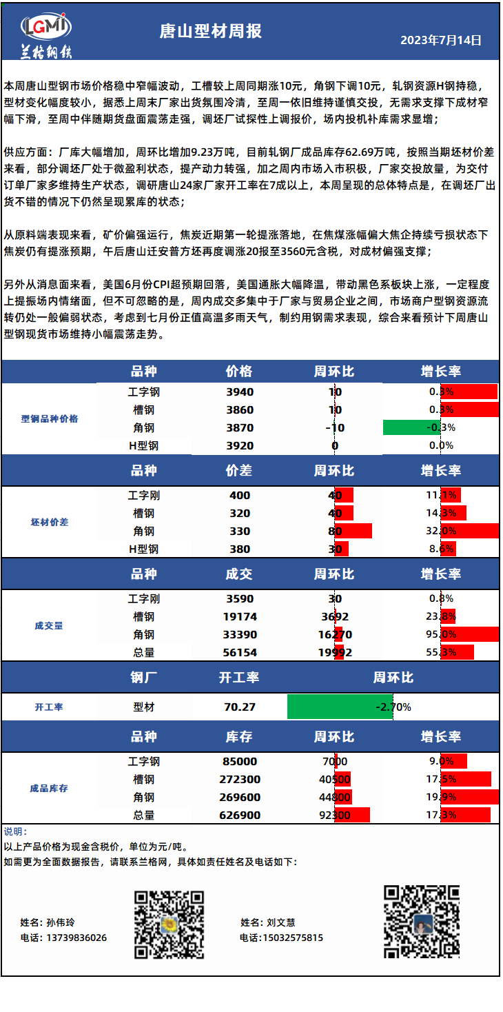 - 收评:今日唐山型钢价格震荡上涨,午后投机需求有所释放,成交明显回暖2023/7/14