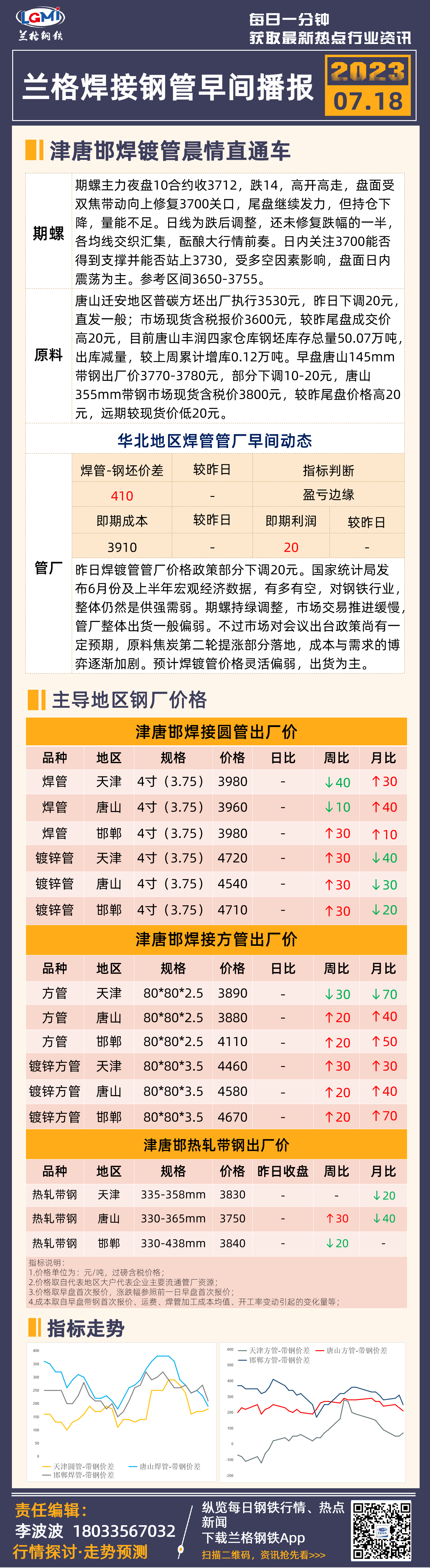 7月18日(9:20)兰格津唐邯焊管、镀锌管早间速递