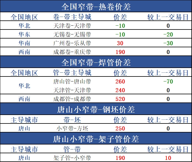 从品种价差来看,天津卷带价差10元,无锡卷带价差10元,广州-乐从卷带价差30元,成都-重庆卷带价差190元;唐山管带价差260元,天津管带价差240元,成都管带价差520元;唐山坯带价差250元,唐山架子管带价差190元。
