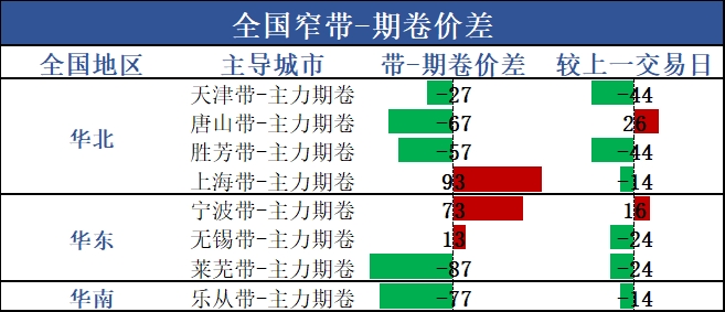 全国窄带期卷价差较上一交易日窄幅波动,具体如下: