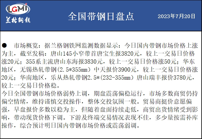 - 兰格带钢日盘点:市场价格弱势上调 交投氛围一般2023/7/20