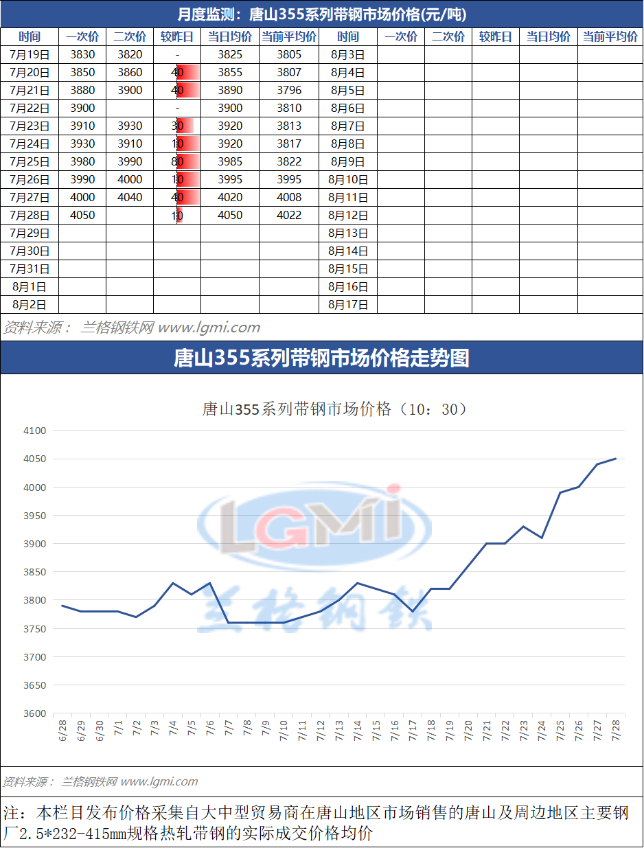 据兰格云商平台监测数据显示,截至7月28日(10:30),唐山地区355系列带钢市场价格为4050元,较昨日市场收盘价格涨10元。
