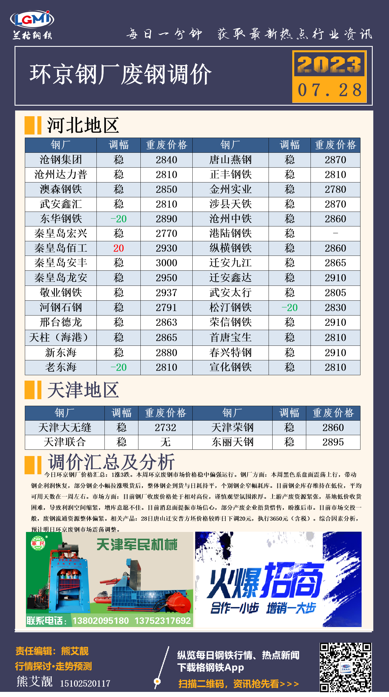 - 7月28日环京钢厂废钢调价汇总2023/7/28