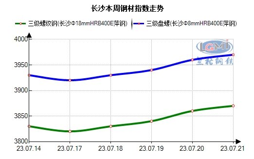 本周长沙建材价格延续上涨趋势,周度累计上涨50元/吨,涨幅较上周扩大,截止目前,萍钢Ф18抗震螺纹3870元/吨,Ф8抗震盘螺3970元/吨。受资源短缺的影响,部分螺纹钢开始加价出售。其中,钢厂和贸易商陆续发函,将于8月1号把抗震Ф22从刚原来的不加价调整到在基础规格Ф18上加价80元/吨,规格差发生变化。