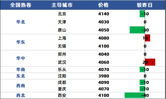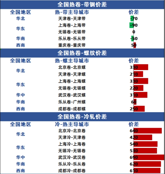 南北区域价差有所增加。上海-唐山价差30元,上海-天津价差50元,乐从-邯郸价差70元,乐从-唐山价差20元。