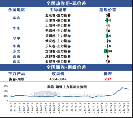 热卷现货较期货价差窄幅波动,卷螺差237。