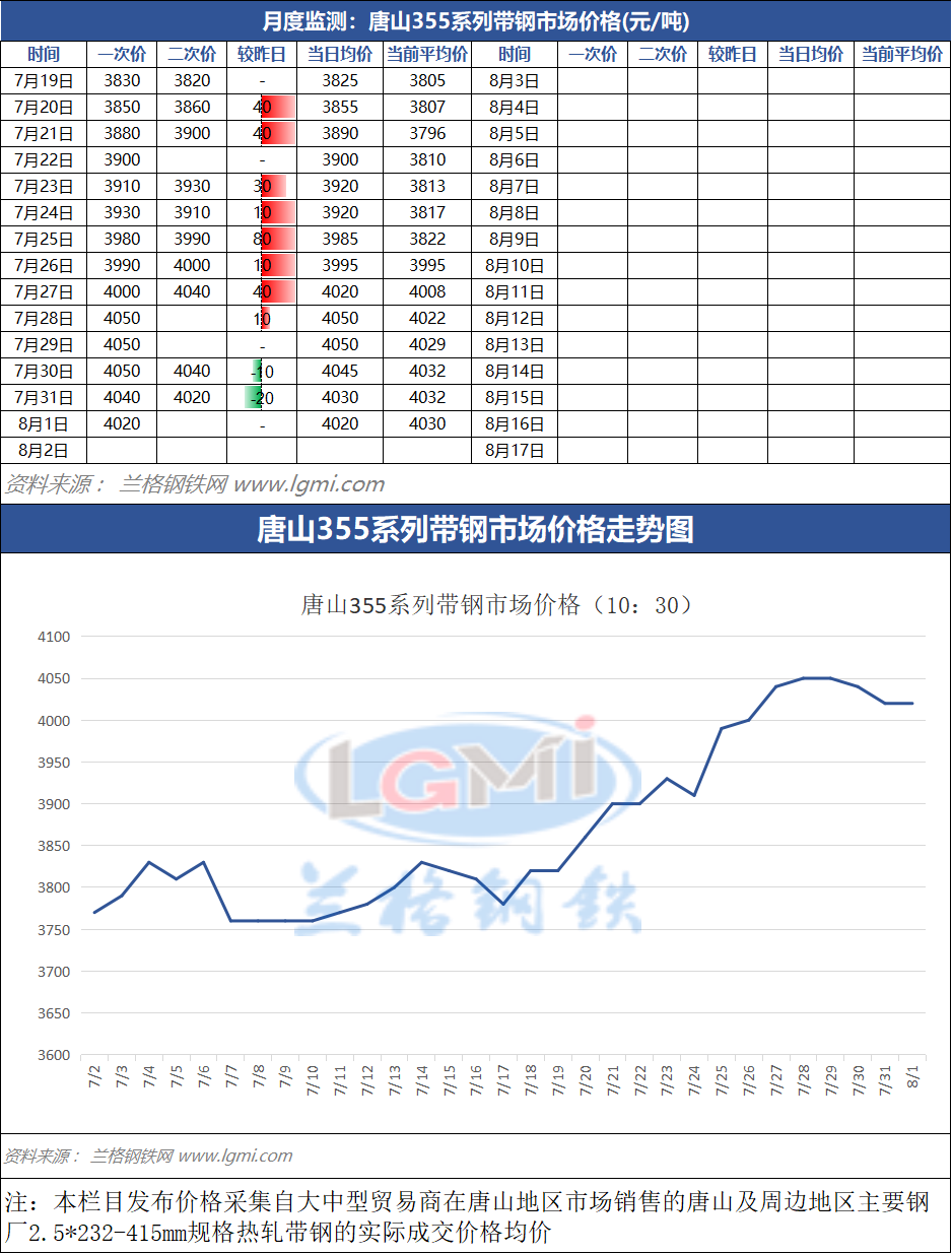 据兰格云商平台监测数据显示,截至8月1日(10:30),唐山地区355系列带钢市场价格为4020元,较昨日市场收盘价格持稳。