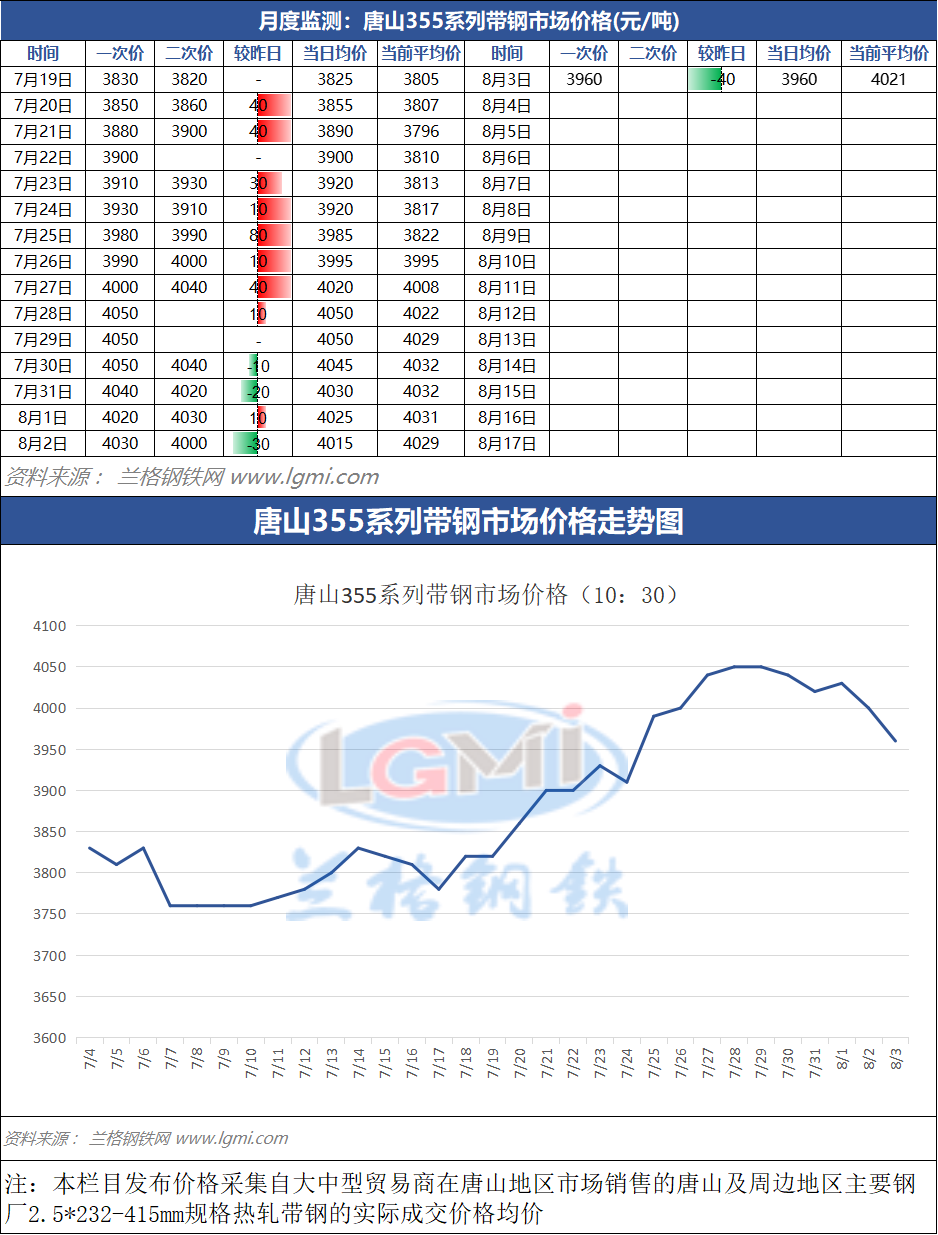 据兰格云商平台监测数据显示,截至8月3日(10:30),唐山地区355系列带钢市场价格为3960元,较昨日市场收盘价格降40元。