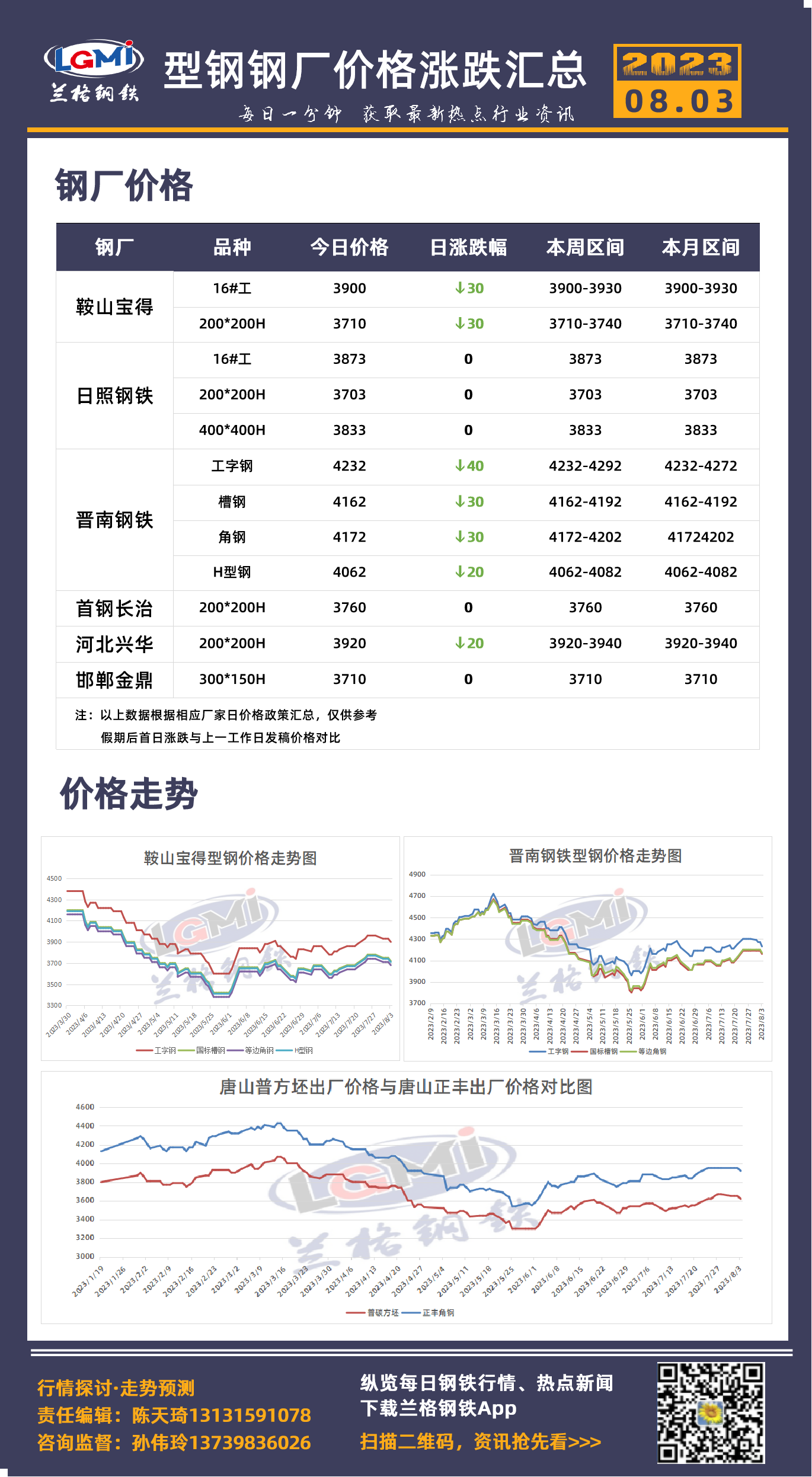 8月3日型钢钢厂价格涨跌汇总