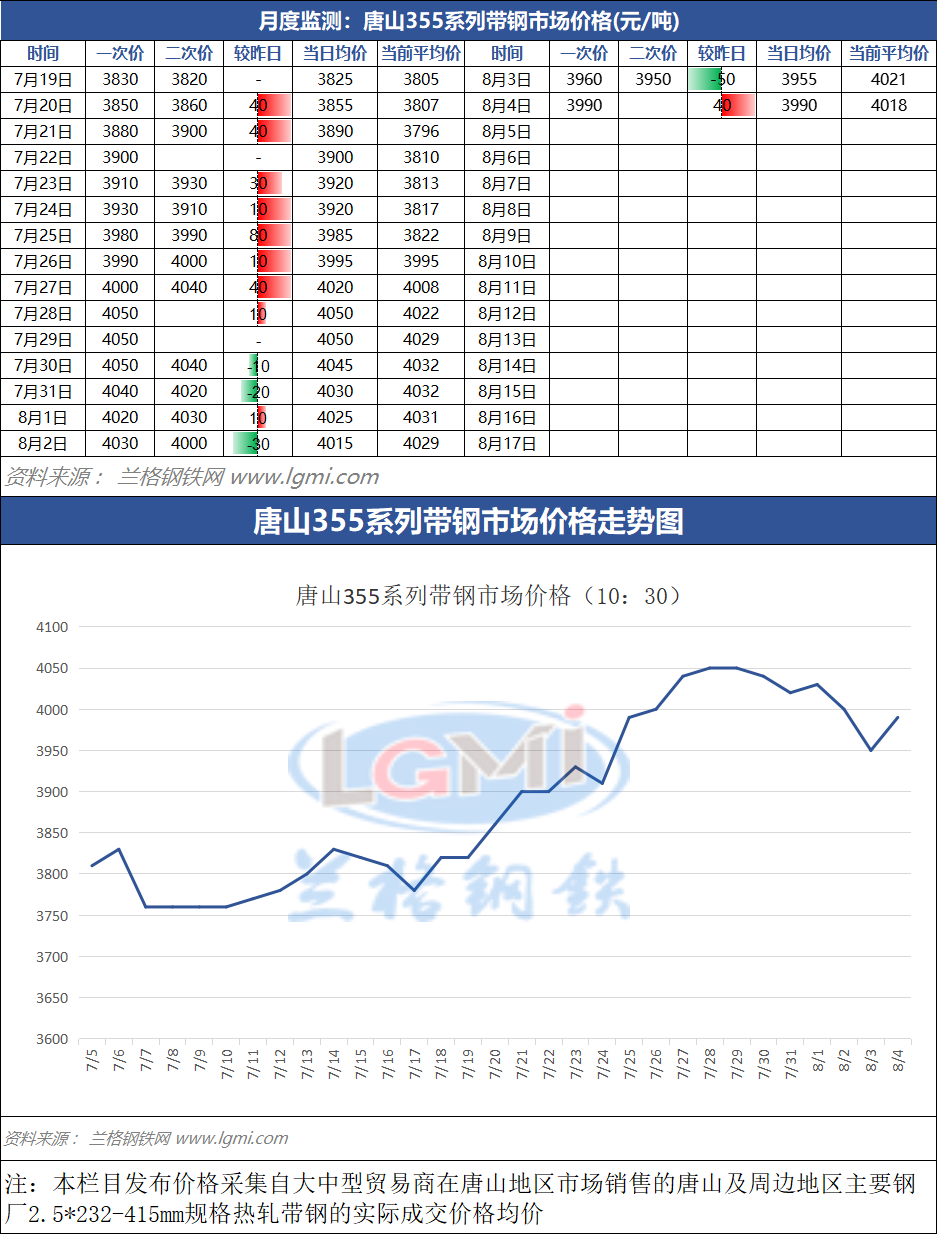 据兰格云商平台监测数据显示,截至8月4日(10:30),唐山地区355系列带钢市场价格为3990元,较昨日市场收盘价格涨40元。
