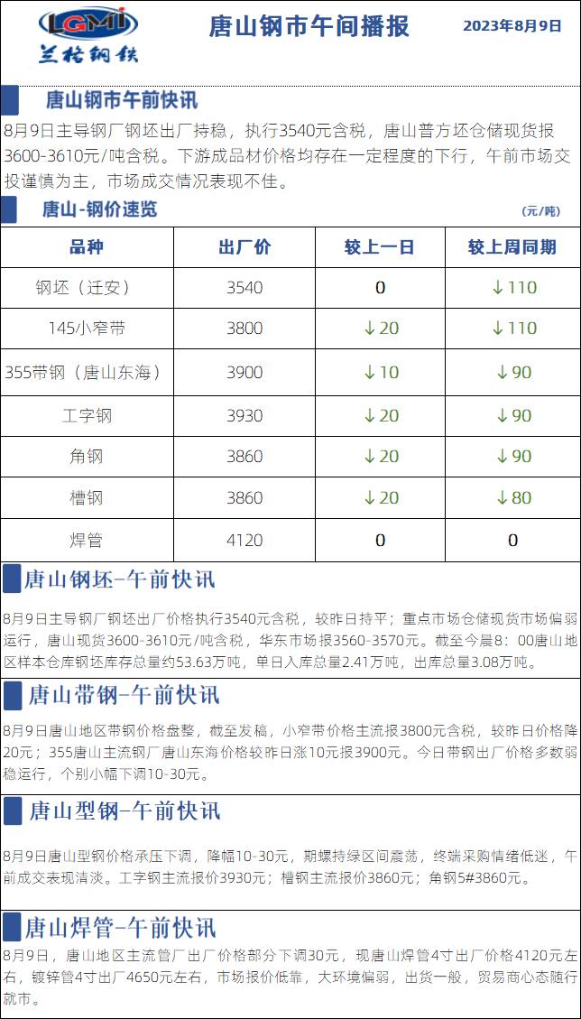 - 8月9日兰格唐山钢市午间播报2023/8/9
