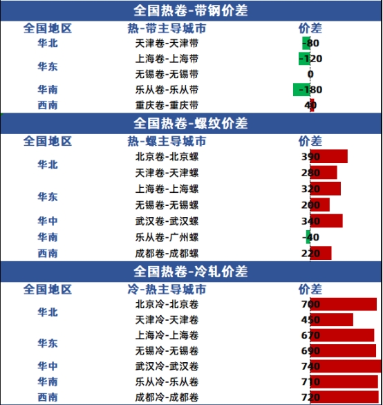 品种价差方面,热卷-带钢价差窄幅波动,热卷-螺纹价差有所增加、冷卷-热卷价差波动有限。