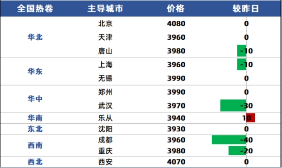 8月9日,现热轧5.5mm国内主导城市价格:天津3960元、上海3960元、乐从3940元、武汉3970元、成都3960元。