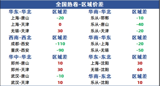南北区域价差倒挂幅度有所下降。上海-唐山价差-20元,上海-天津价格持平,乐从-邯郸价差-10元,乐从-唐山价差-40元。