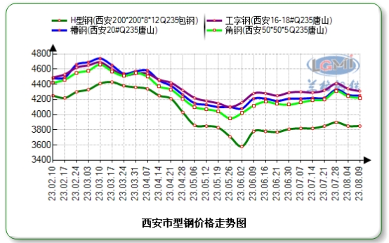 兰格钢铁云商平台监测数据显示:西安市场16-18#工字钢价格为4310元;20#槽钢价格为4250元;5#角钢价格为4220元;200*200H型钢价格为3850元。