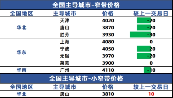 ●市场概览:据兰格钢铁网监测数据显示:今日国内带钢市场价格主流下调,截至发稿:唐山145小窄带首唐宝生报3810元,较上一交易日价格涨10元;355系主流唐山东海报3870元,较上一交易日价格降20元;华东地区,无锡热轧带钢(2.5*355mm)中天报价3970元,较上一交易日价格降20元;华南地区,乐从热轧带钢2.5*(232-355mm)唐山瑞丰报价4110元,较上一交易日价格降10元。