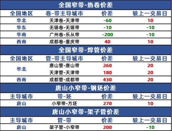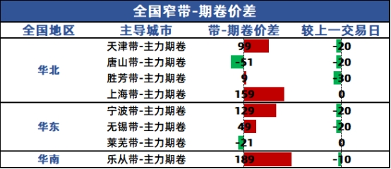 全国窄带期卷价差较上一交易日缩小,具体如下: