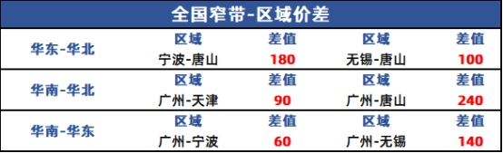 从区域价差来看,华东与华北价差100-180元;华南与华北价差90-240元;华南与华东价差60-140元。
