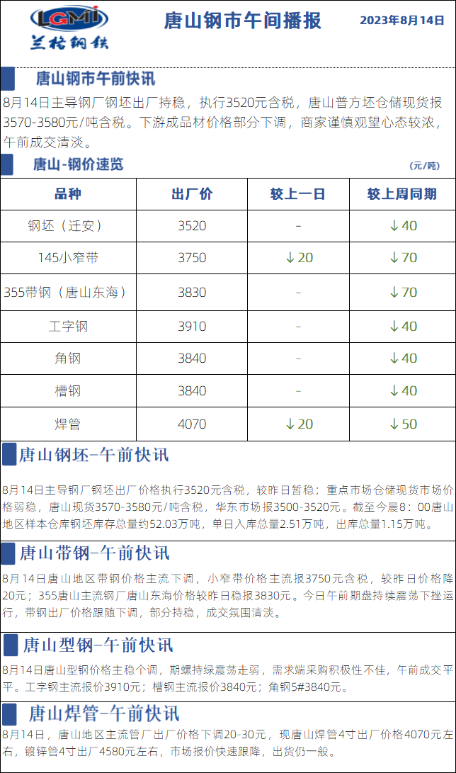 - 14日山西晋南钢铁型钢挂牌价格稳2023/8/14