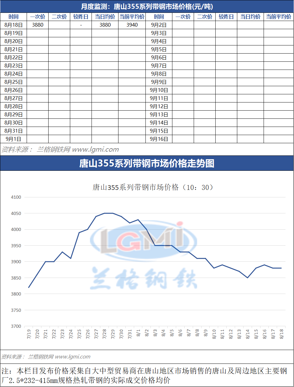 据兰格云商平台监测数据显示,截至8月18日(10:30),唐山地区355系列带钢市场价格为3880元,较昨日市场收盘价格持稳。
