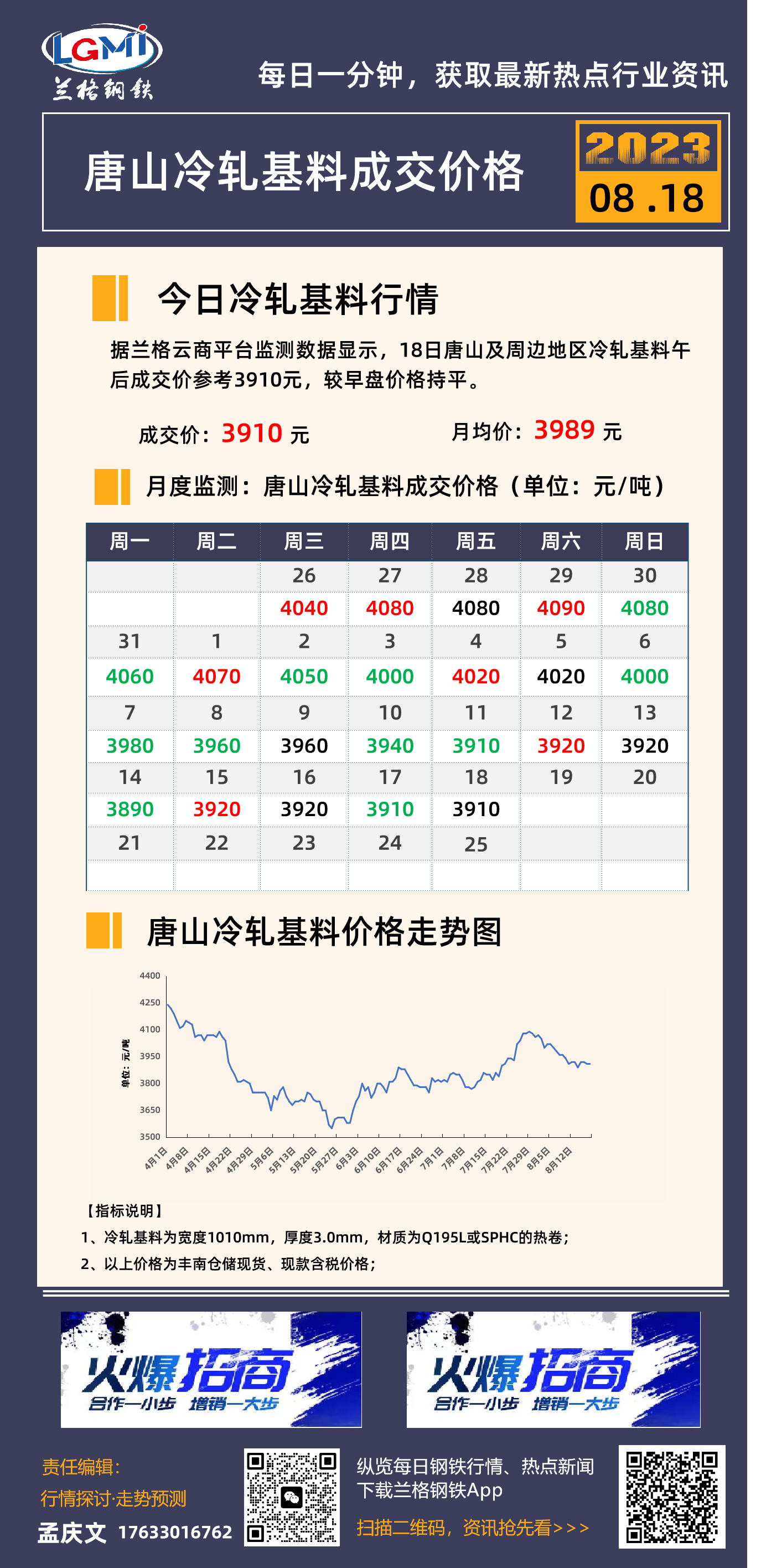 8月18日唐山冷轧基料成交价格