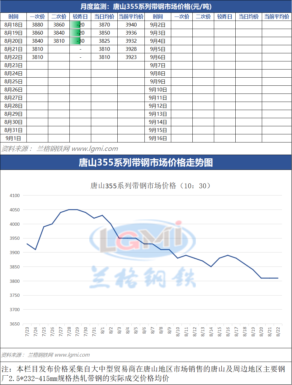 据兰格云商平台监测数据显示,截至8月22日(10:30),唐山地区355系列带钢市场价格为3810元,较昨日市场收盘价格持稳。