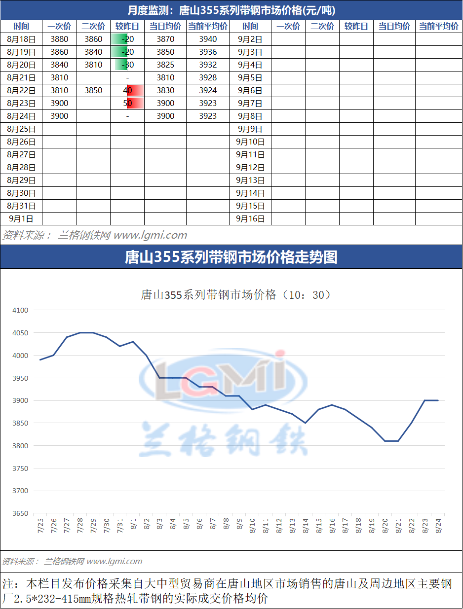 据兰格云商平台监测数据显示,截至8月24日(10:30),唐山地区355系列带钢市场价格为3900元,较昨日市场收盘价格稳。