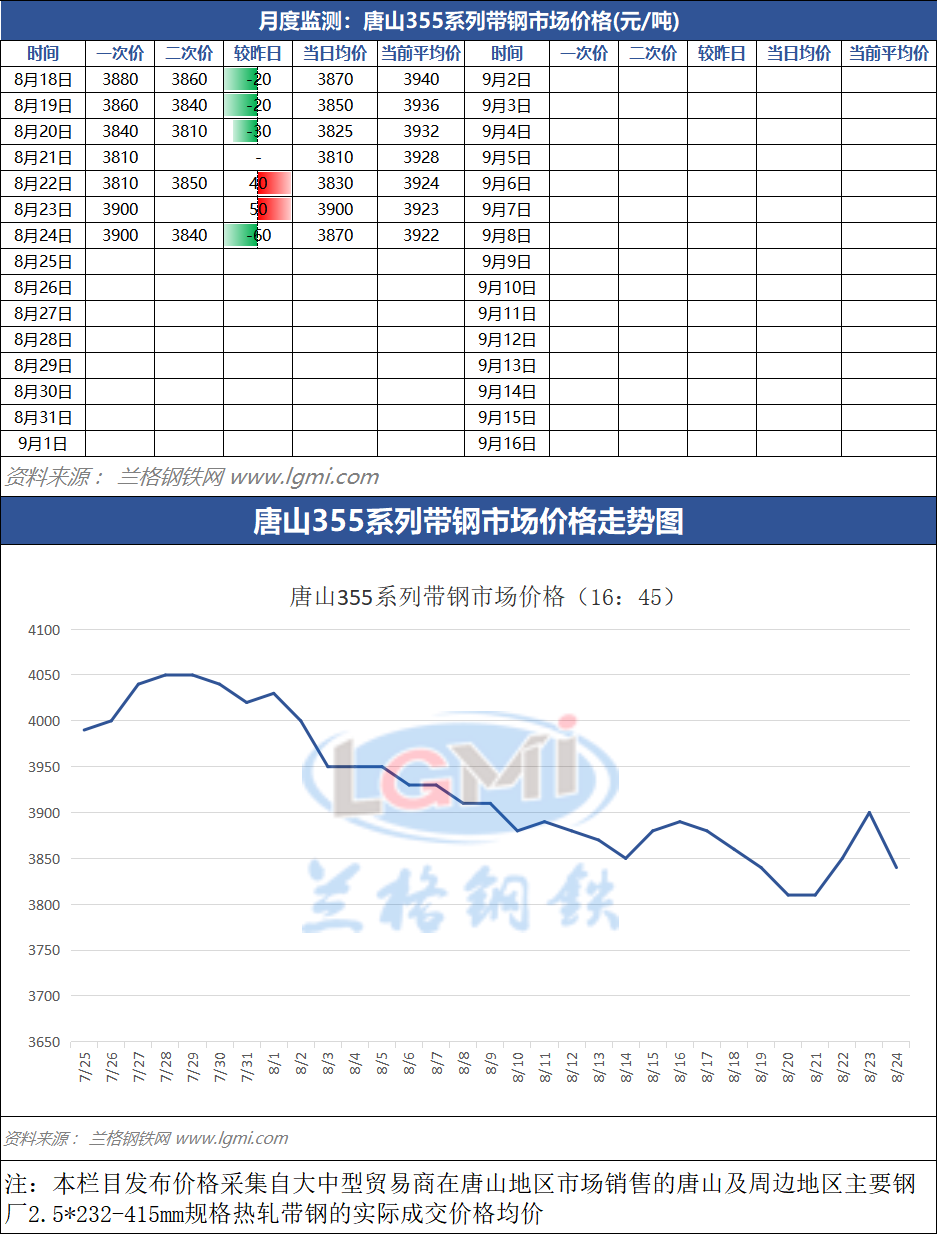据兰格云商平台监测数据显示,截至8月24日(16:45),唐山地区355系列带钢市场价格为3840元,较早盘价格降60元,较昨日市场收盘价格降60元。