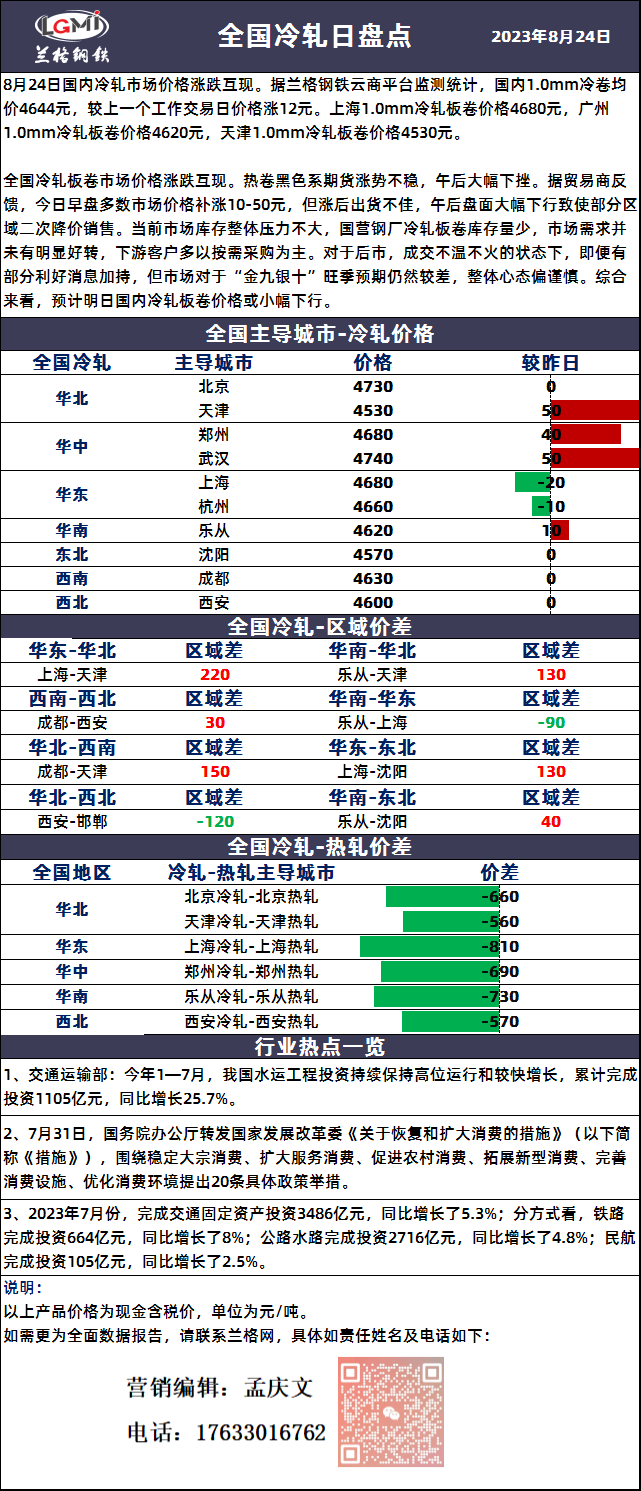发表日期:2023/8/24 17:06:42 兰格钢铁-赵丽娜 兰格钢铁网