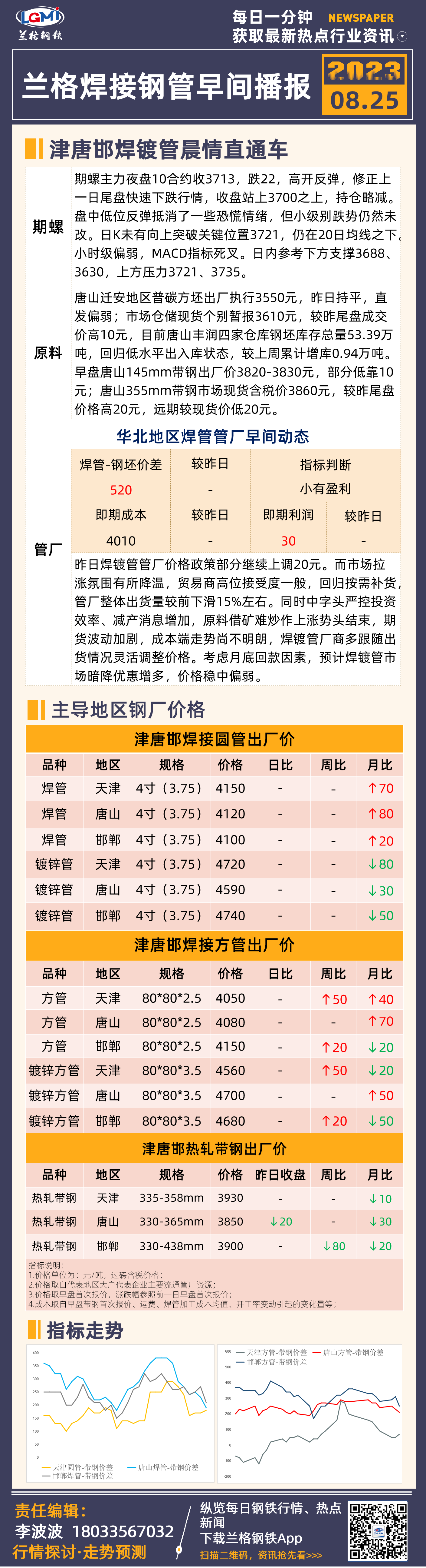 8月25日兰格津唐邯焊管、镀锌管早间速递