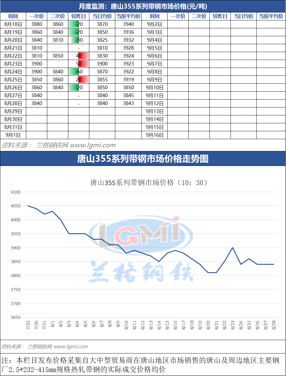 据兰格云商平台监测数据显示,截至8月28日(10:30),唐山地区355系列带钢市场价格为3840元,较昨日市场收盘价格持稳。
