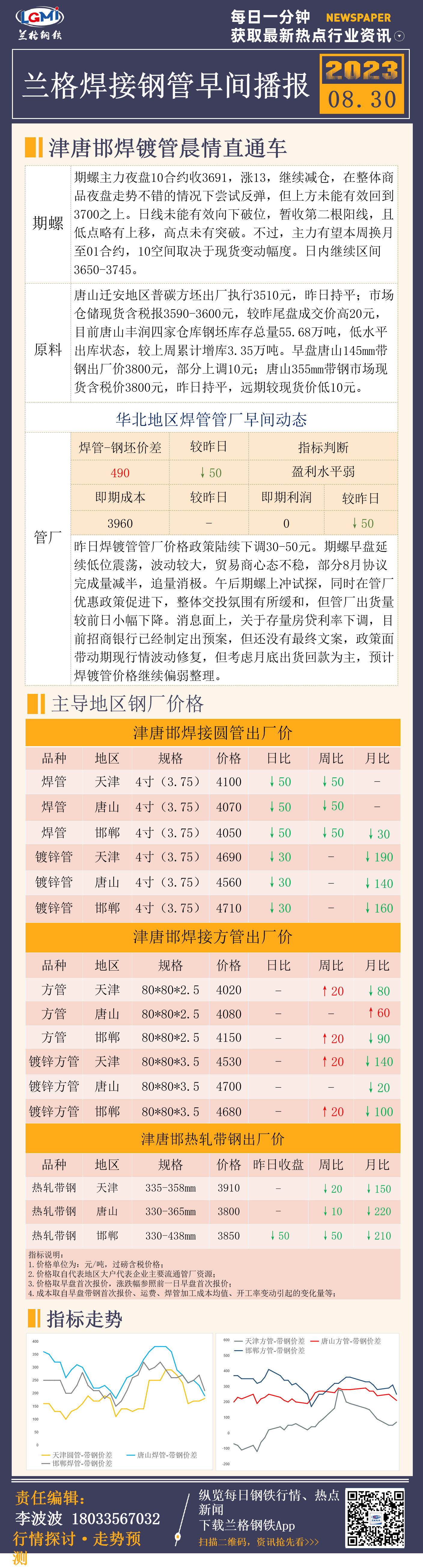 - 8月30日兰格焊管、镀锌管早间速递2023/8/30