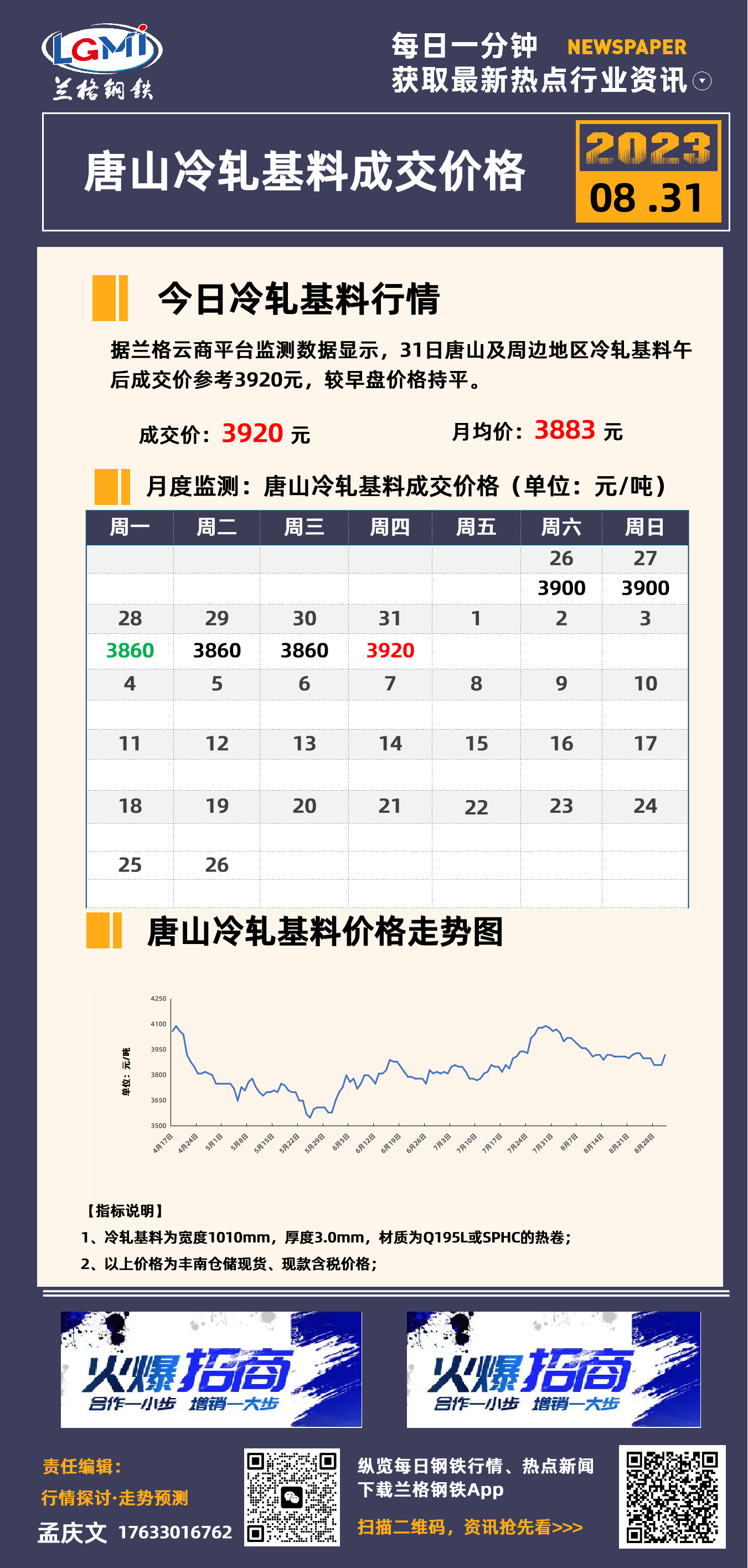 8月31日唐山冷轧基料成交价格
