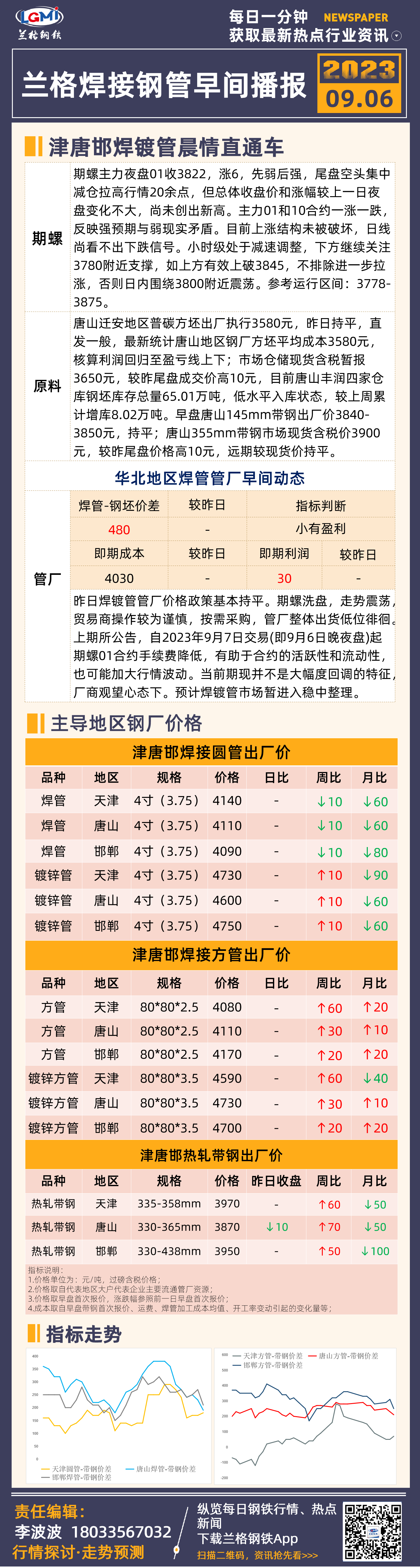 9月6日兰格津唐邯焊管、镀锌管早间速递