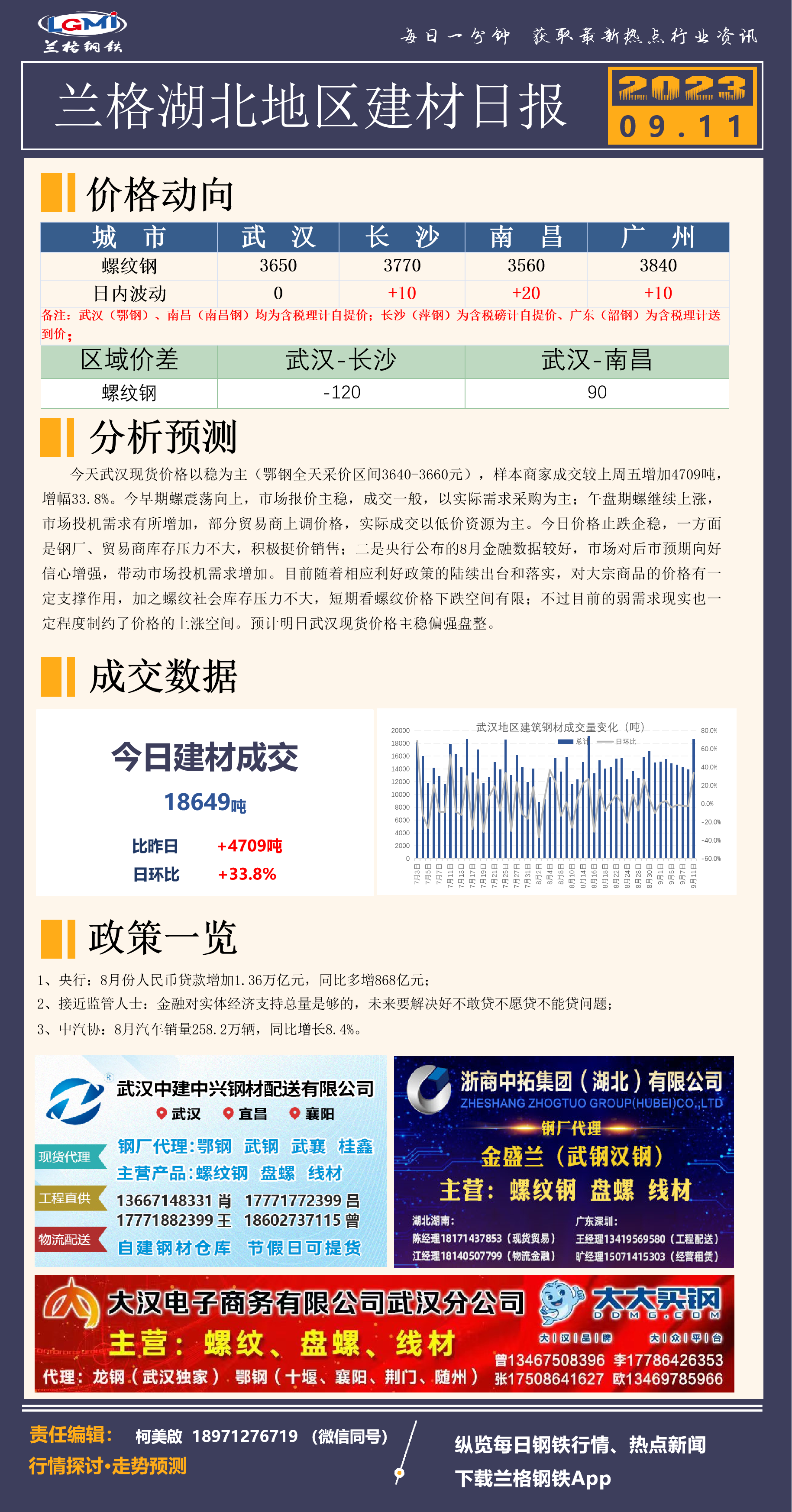 - 武汉市场建材价格偏弱调整 成交一般2023/9/7