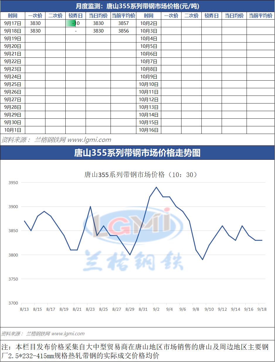 据兰格云商平台监测数据显示,截至9月18日(10:30),唐山地区355系列带钢市场价格为3830元,较昨日市场收盘价格持稳。